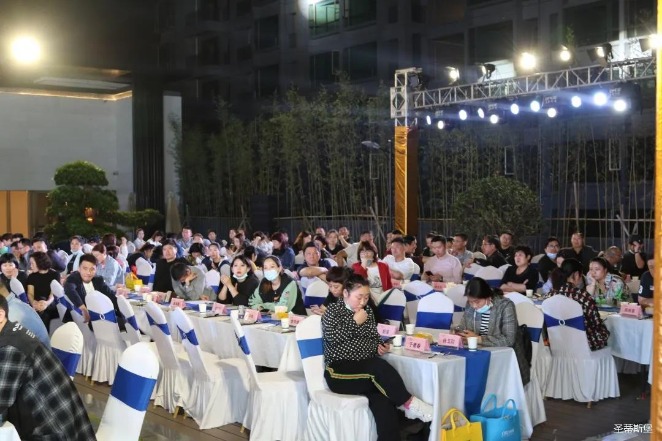 经销商晚宴当日晚6时许,以【乘“圣”跨越】为主题的,Huatihui集团第45届国际家具展接待晚宴暨2020年度优秀经销商颁奖盛典,在营销中心四楼景观花园隆重举行,来自全国各地的经销商朋友欢聚一堂,共同分享一场精彩纷呈的晚宴。