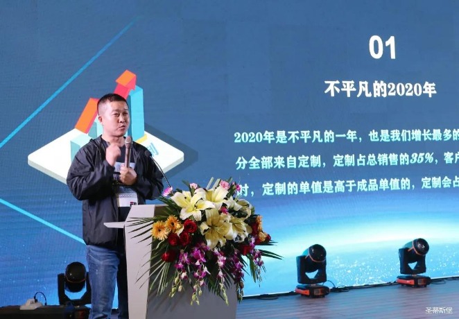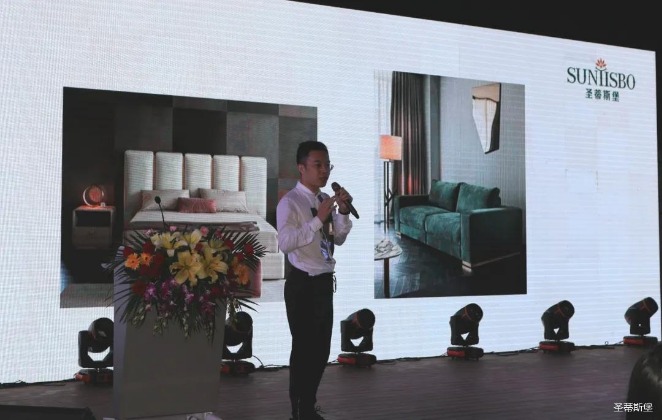 华灯璀璨的开场仪式,点燃了现场如火如荼的气氛。Huatihui集团营销总经理陈玉伟先生对晚会进行了主题发言,他对2020年的营销工作进行了总结,并着重从营销工作部署、重点项目开展、产品整合、拎包帮扶、渠道运营和移动+定制整装优势等方面对2021年的营销工作做了全面的统筹规划。同时,他还讲解了“美国梦凯莎床垫”新品的产品工艺、市场优势、产品定位,使经销商对我们的新产品拥有更深入的认识和了解。