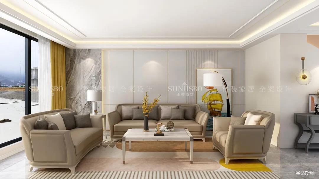 客厅设计置顶展示柜和大理石,实现了现代和轻奢风格间的均衡组合。温柔莫兰迪色调的沙发,细节的实木底座和人性化的环抱式设计让空间更添温馨的气息。